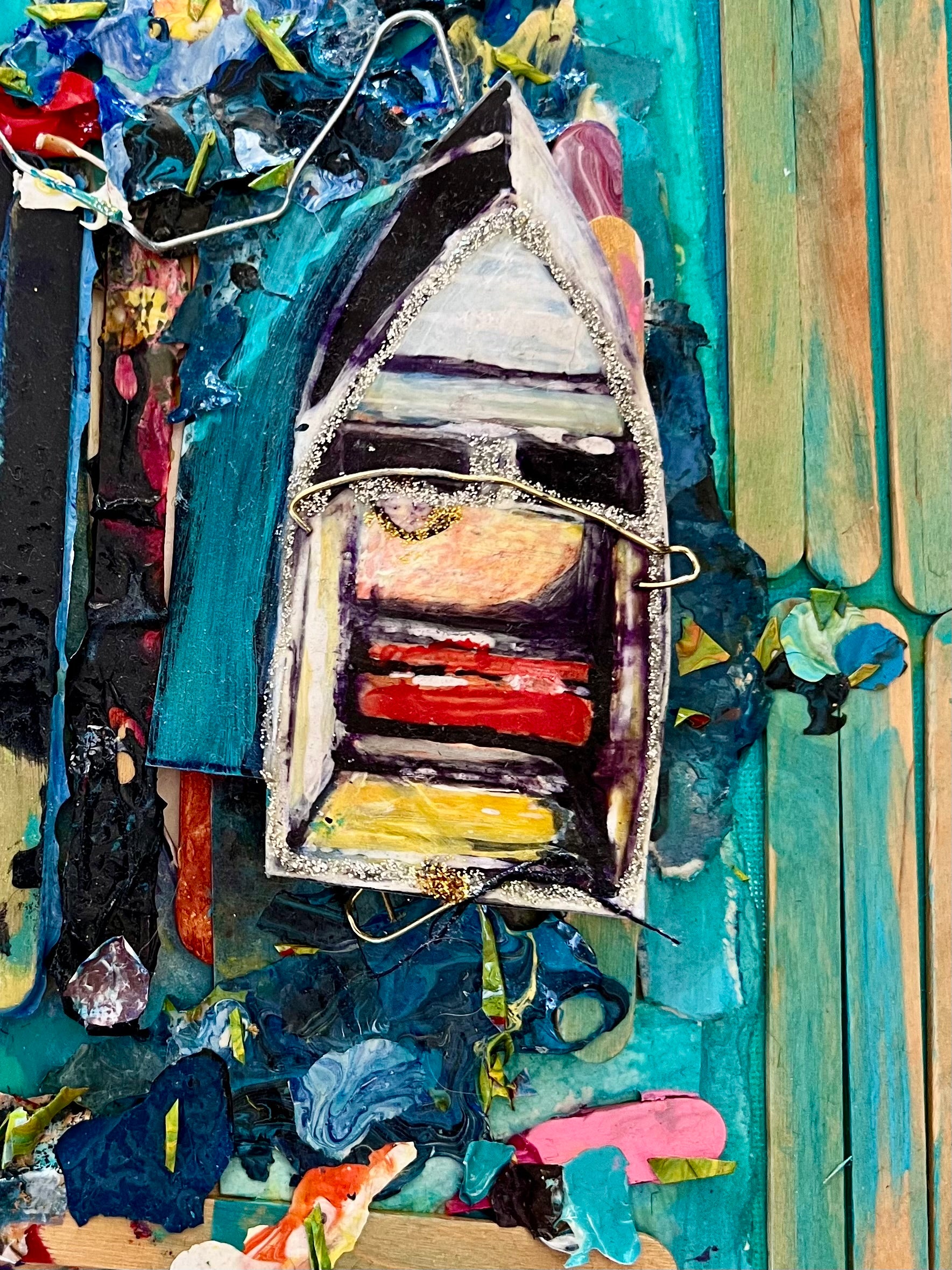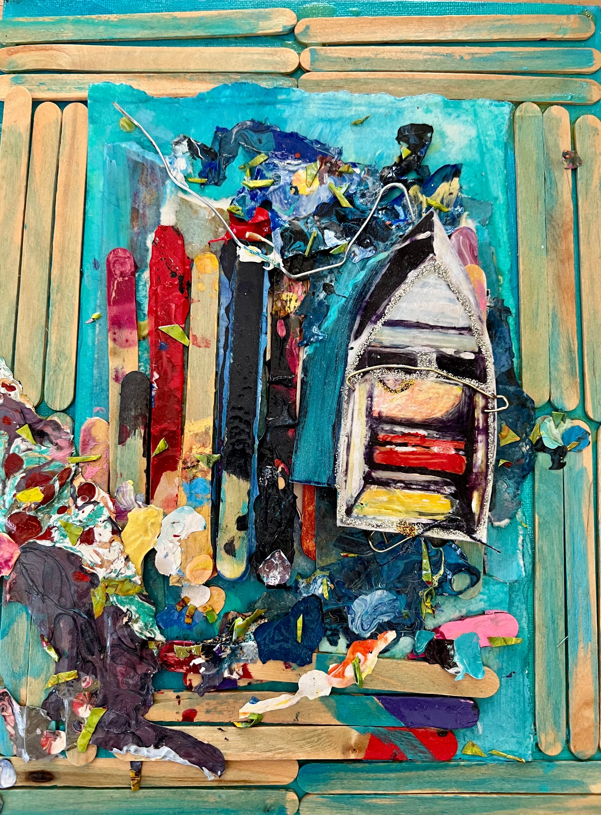 Mixed Media Boating /Beach Painting with a twist of wooden popsicle sticks, acrylic paint, lost and found interesting finds for this One Of A Kind gem. 8 x 10