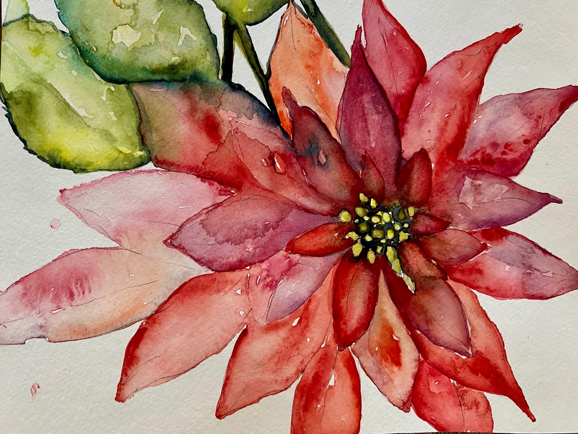 This original watercolor painting captures the elegant beauty of a poinsettia in full bloom, perfect for adding festive cheer to any space. The artwork showcases delicate, layered petals in vibrant reds and soft pinks, blending seamlessly with fresh green leaves for a naturally luminous effect. Subtle washes and textural details bring the flower to life, highlighting the artistry and gentle movement of watercolor. This one-of-a-kind piece is ideal for holiday decor or as a charming gift for flower and art lovers. 8.5 x 11 original Watercolor Painting