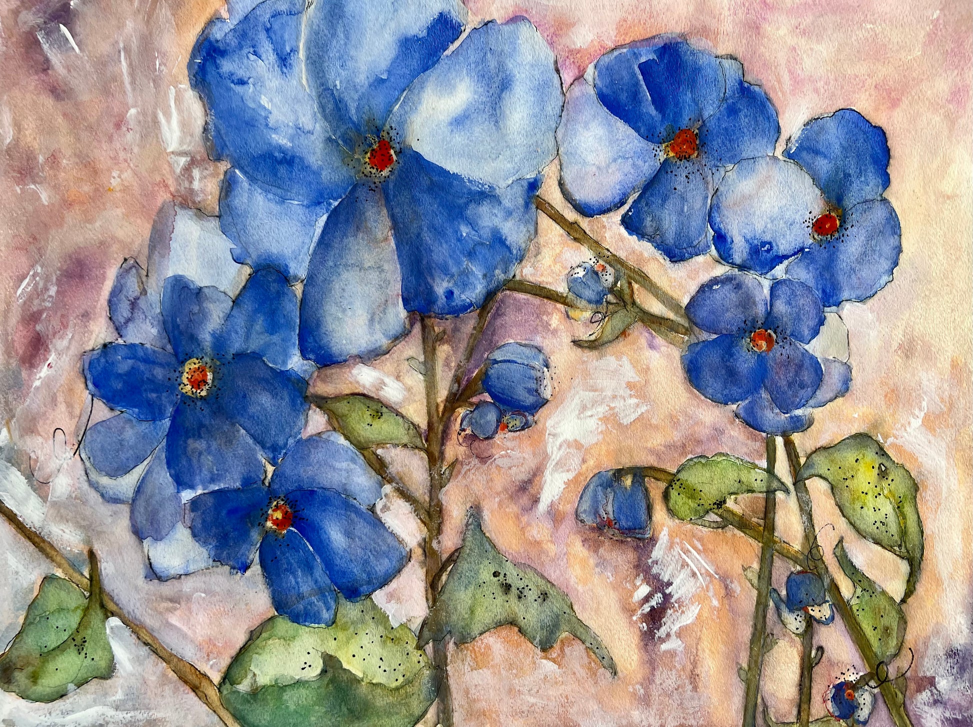 The artwork is a painting of vibrant blue flowers with rich, textured petals. The flowers are depicted in full bloom, showcasing deep blue hues with subtle shading to convey depth. The centers of the flowers are accented with small touches of red. The green leaves and stems surrounding the flowers have a natural, slightly curved form, with some leaves showing a mix of green and hints of brown, indicating varied tones and textures. The background is a muted blend of warm beige and light pink tones, which contrasts with and enhances the vivid blue of the flowers. The painting combines realism with expressive brushstrokes, creating a lively and elegant floral composition.