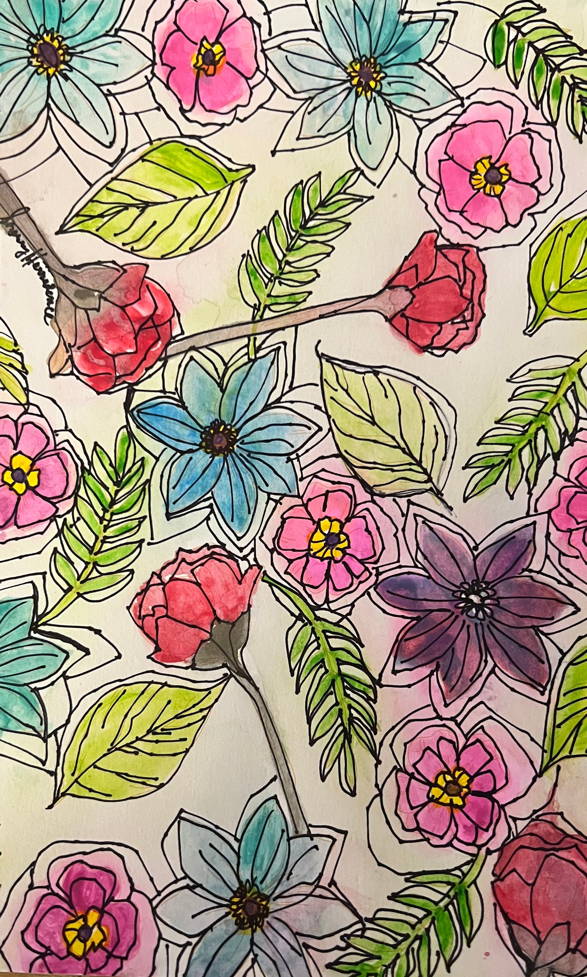 The artwork is a vibrant floral composition featuring a variety of flowers and leaves intricately drawn and watercolored. The flowers are in multiple colors, including shades of pink, blue, red, and purple, each with detailed petals and central stamen highlights in yellow and darker hues. The leaves are different shapes and sizes, predominantly shaded in green with distinct vein patterns. Thin branches weave through the design, connecting the flowers and leaves, creating a balanced and lively arrangement. The style combines delicate line work with soft, transparent watercolor, giving the piece a fresh and dynamic feel.
