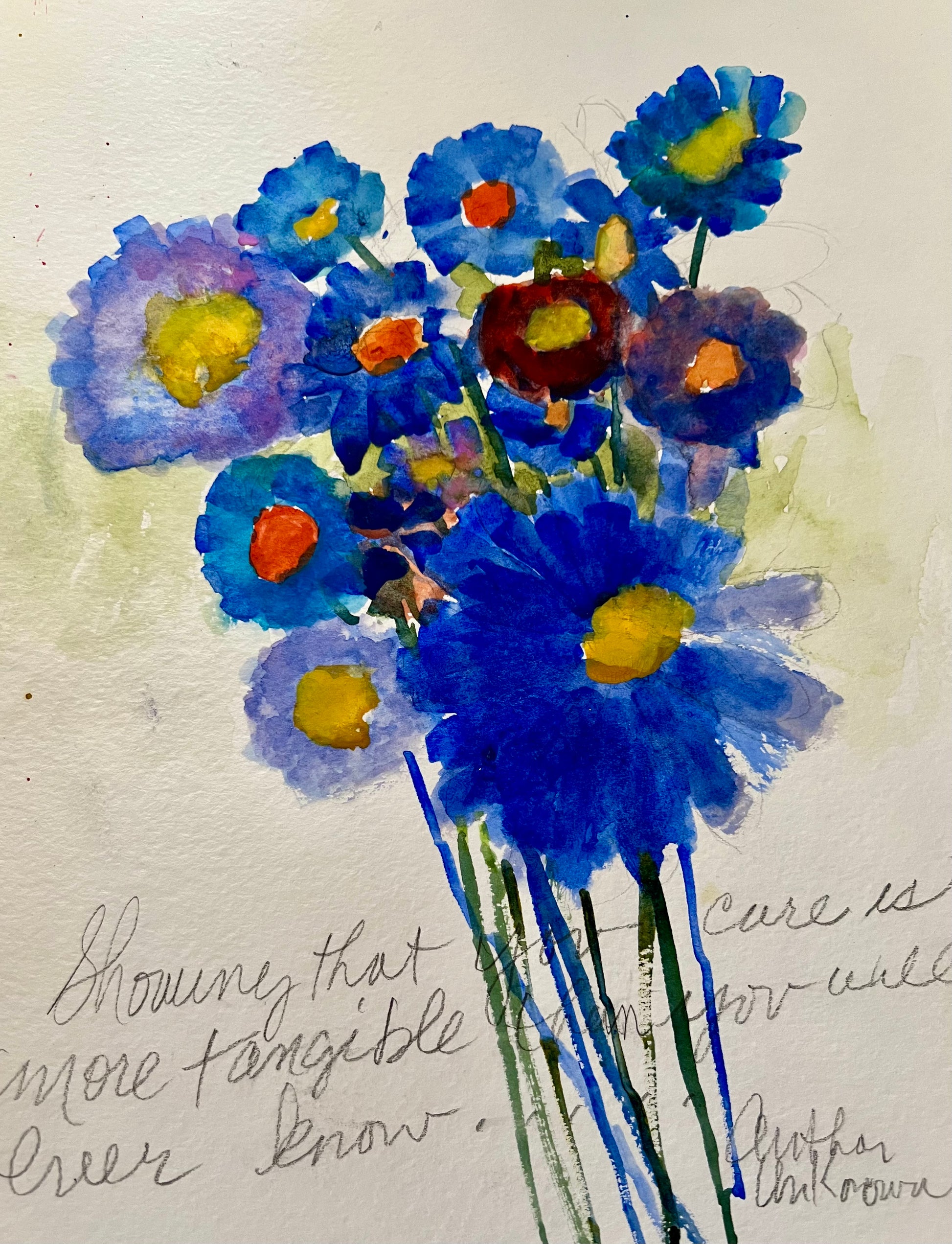 The artwork is a watercolor painting featuring a bouquet of vibrant blue flowers with yellow and orange centers. The flowers vary in shape and size, clustered closely together, creating a lively and textured composition. The stems are thin and green, extending downward from the blossoms. The background is minimal, allowing the colorful flowers to dominate the space. Below the bouquet, cursive handwriting written in pencil is visible, adding an element of personal expression to the piece. The overall style is loose and expressive, highlighting the delicate and spontaneous nature of the watercolor medium.