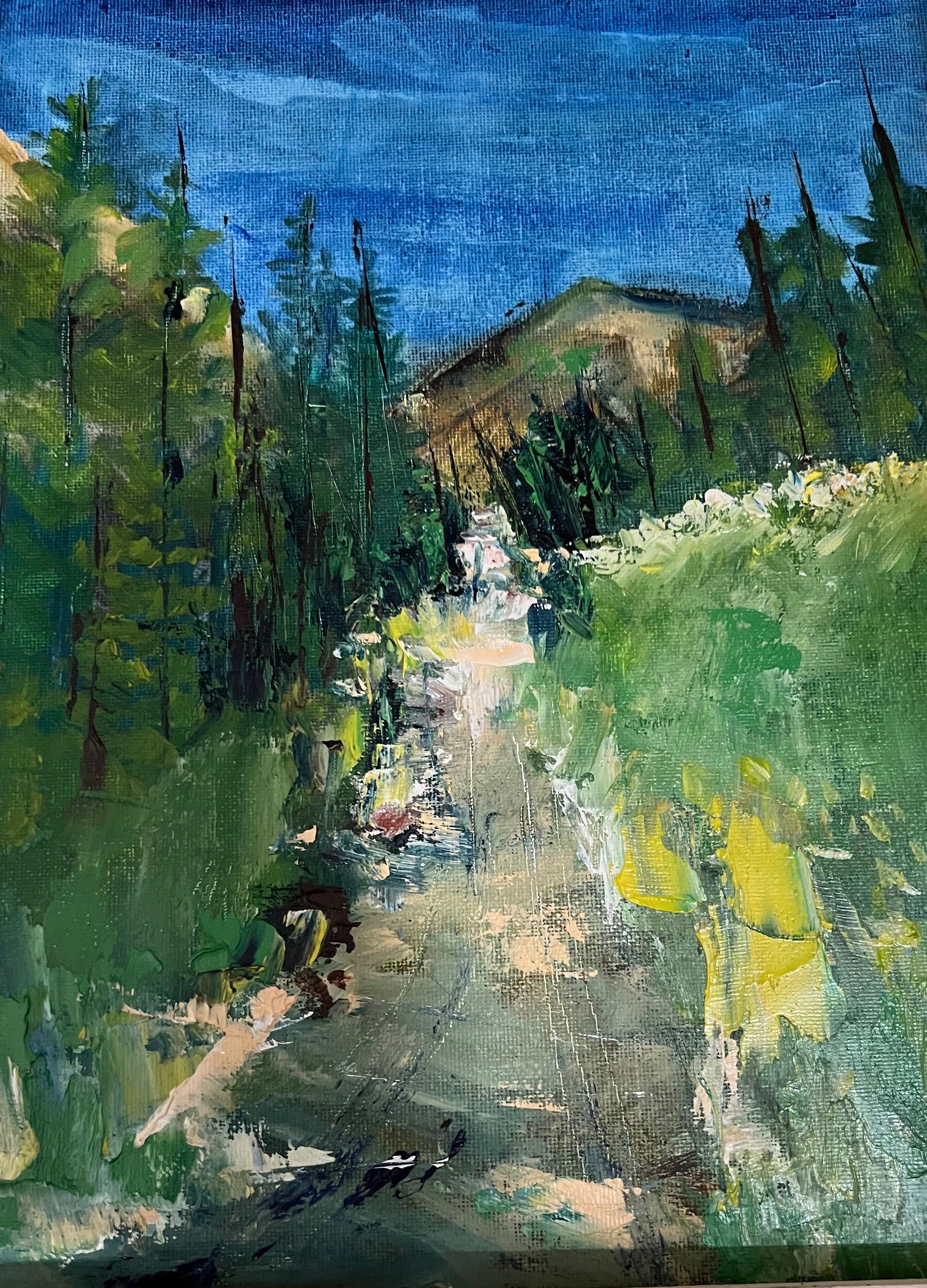 The artwork is a landscape painting showcasing a serene natural trail winding through a vibrant field. The foreground features a narrow path flanked by dense greenery, with various shades of green and yellow suggesting wild grass and shrubs. In the background, tall trees with dark green foliage rise against a softly painted sky, hinting at a peaceful forest setting. The brushstrokes are textured and expressive, adding depth and movement to the scene. Overall, the painting captures the tranquility and beauty of an outdoor trail surrounded by nature.