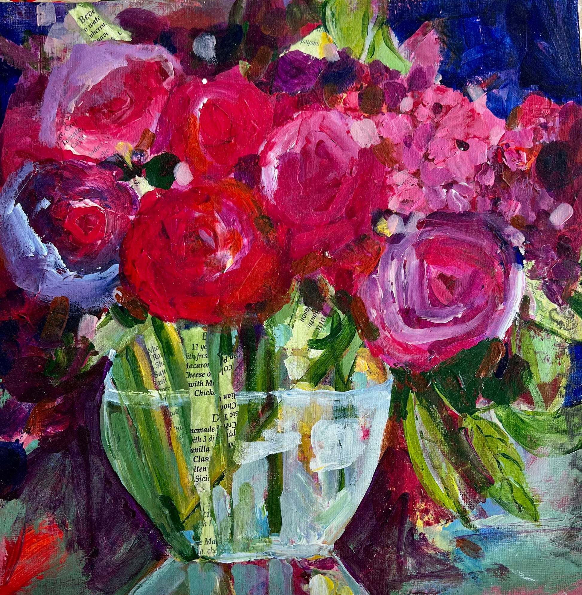 The artwork is a vibrant and expressive painting of a bouquet of flowers placed in a glass vase. The flowers are predominantly shades of red and pink, with a mix of roses and other blossoms. The brushstrokes are bold and textured, creating a sense of depth and movement. The vase showcases reflections and highlights, indicating the transparency of the glass. The background includes darker, cooler tones that contrast with the bright, warm colors of the flowers, emphasizing their lush and lively appearance.
