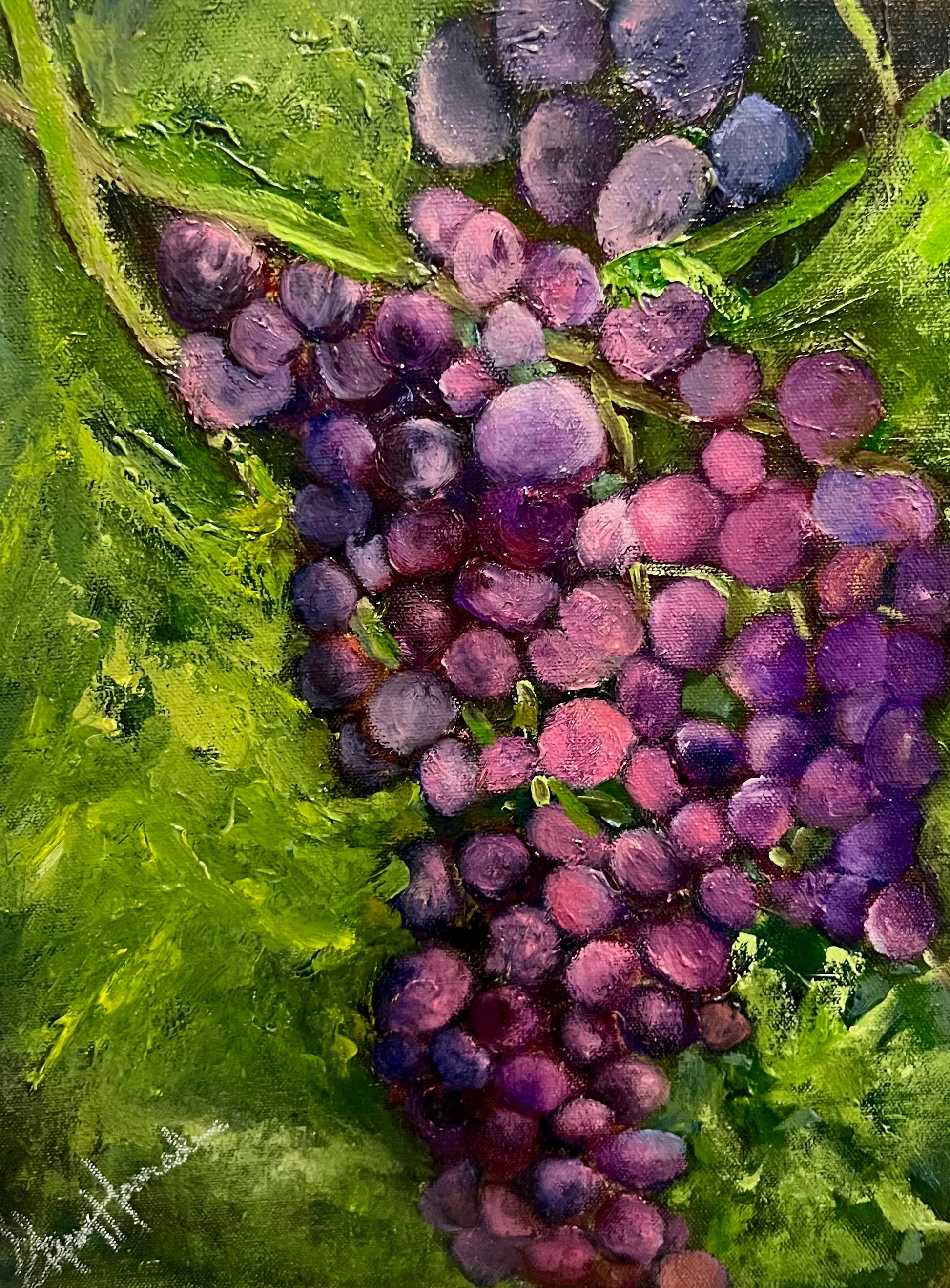 The artwork is a vibrant painting of a cluster of grapes hanging from a vine. The grapes are predominantly shades of purple, ranging from deep violet to lighter lavender hues, with some subtle highlights adding dimension. The leaves surrounding the grapes are rich green with textured brushstrokes, creating a lively contrast against the purple fruit. The composition captures the natural abundance and lushness of the vineyard, with a dynamic use of color and texture that emphasizes the roundness and juiciness of the grapes.