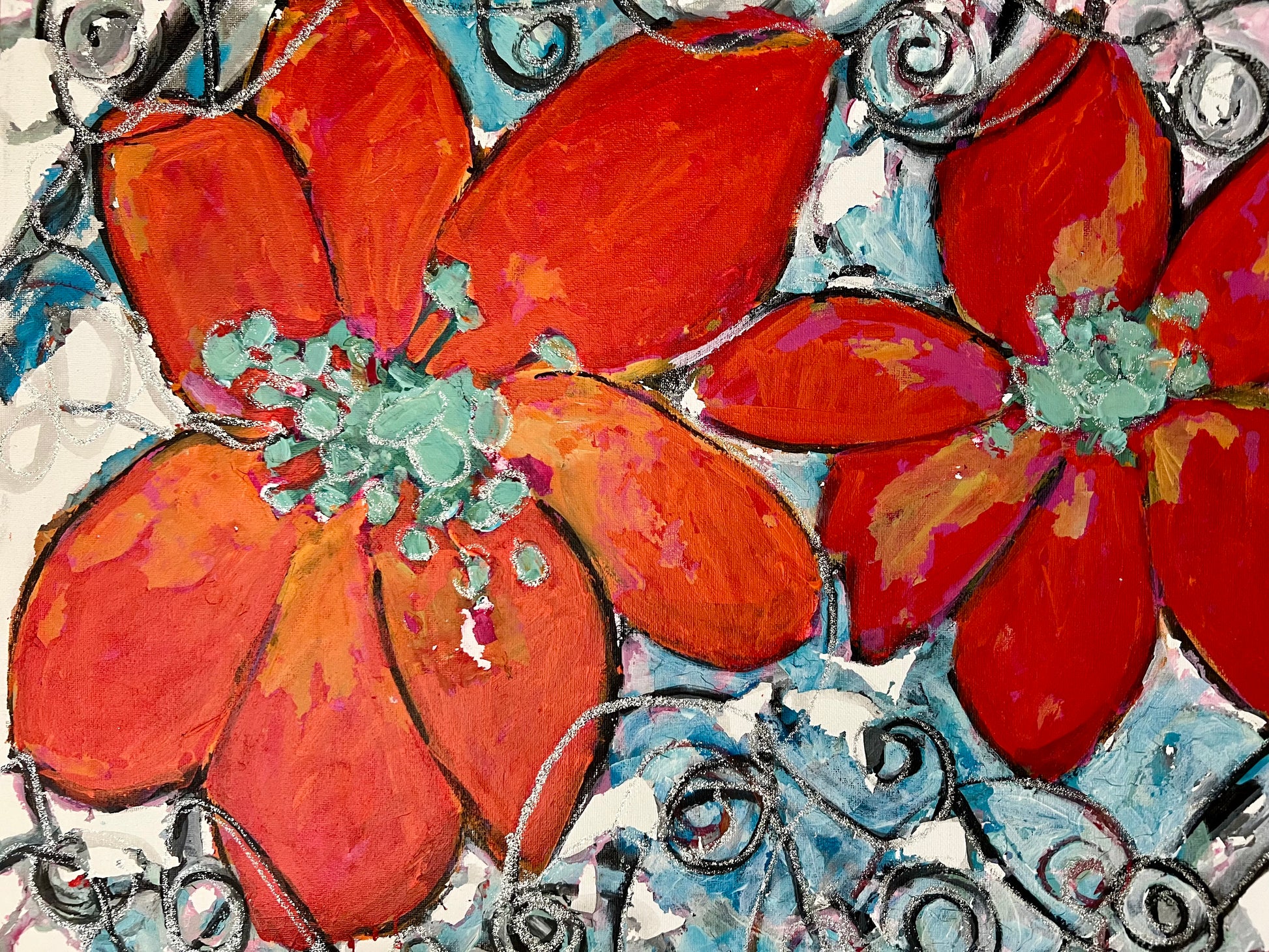 The artwork features two large, vibrant red-orange flowers with textured petals outlined in black. The flowers dominate the composition, set against a background of blue and white with intricate swirling patterns in black that add movement and depth. The centers of the flowers are detailed with clusters of small, light blue elements, contrasting sharply with the warm tones of the petals. The overall style is expressive, with bold colors and dynamic lines enhancing the floral forms.
