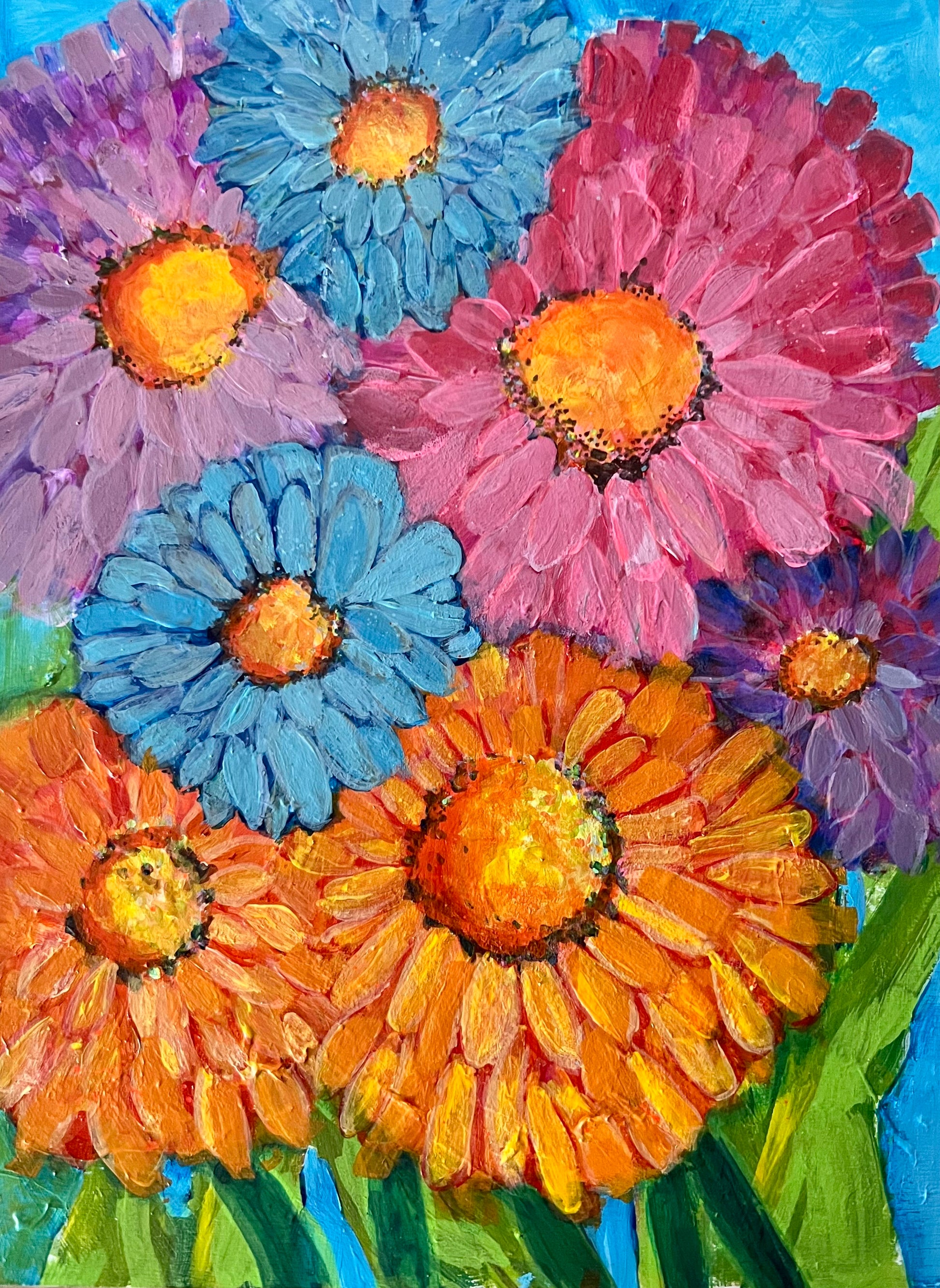 The artwork is a vibrant and textured painting of a bouquet of flowers. The flowers are large and detailed, featuring petals in rich shades of orange, pink, blue, purple, and lilac. Each flower has a prominent yellow-orange center with hints of darker tones, creating a strong focal point. The petals are thickly layered with visible brushstrokes, adding depth and dimension. The background is a bright blue color that contrasts vividly with the flowers. The green stems and leaves are painted with broad strokes, anchoring the composition and enhancing the overall lively and cheerful atmosphere of the painting.