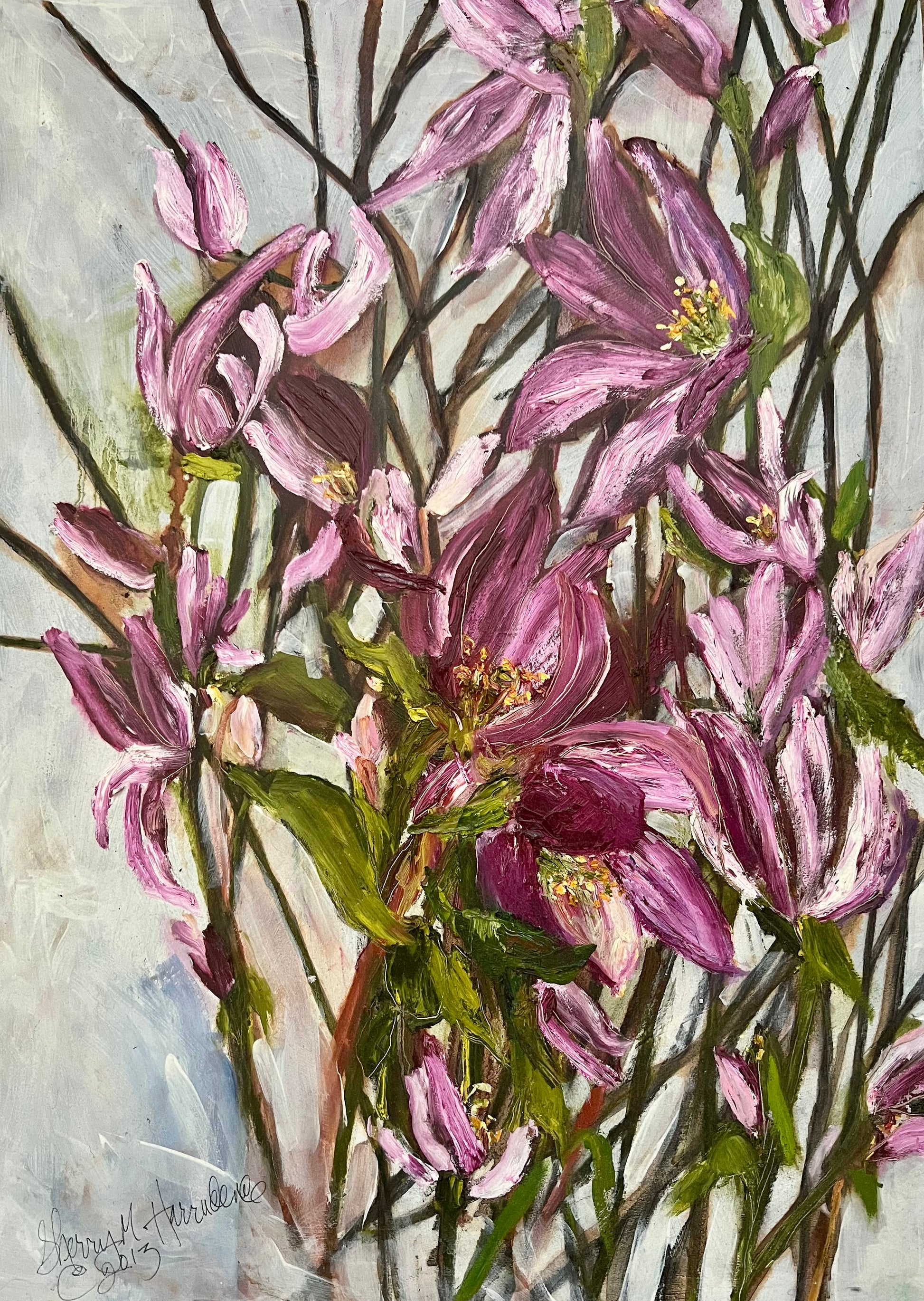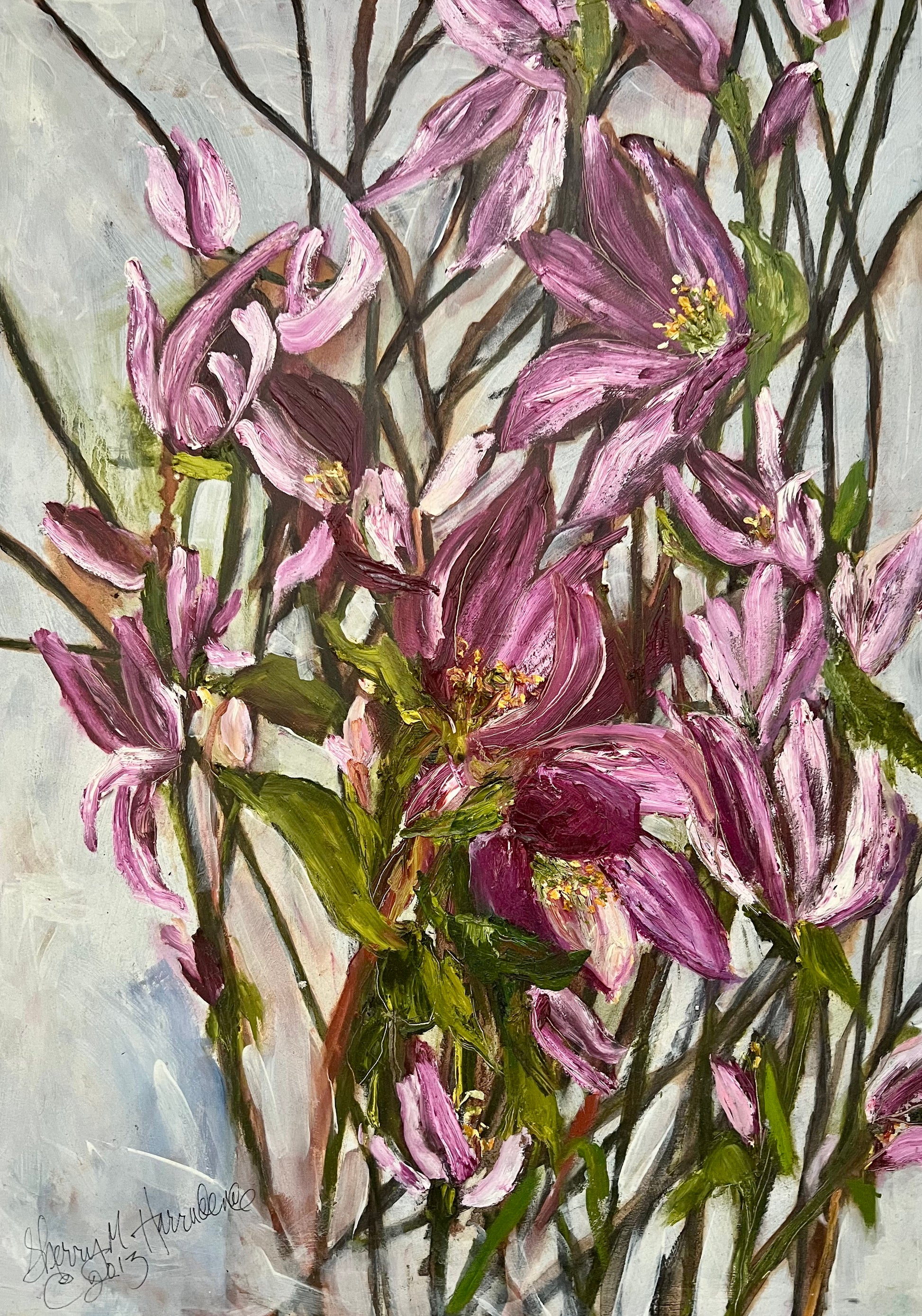 The artwork is a vibrant floral painting featuring an arrangement of purple flowers with prominent petals and yellow centers. The flowers are interspersed with green leaves and brown stems, set against a soft, muted background that enhances the vividness of the blossoms. The brushstrokes are textured and expressive, capturing the organic shapes and delicate details of the flowers in a dynamic and lively composition.