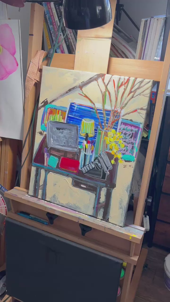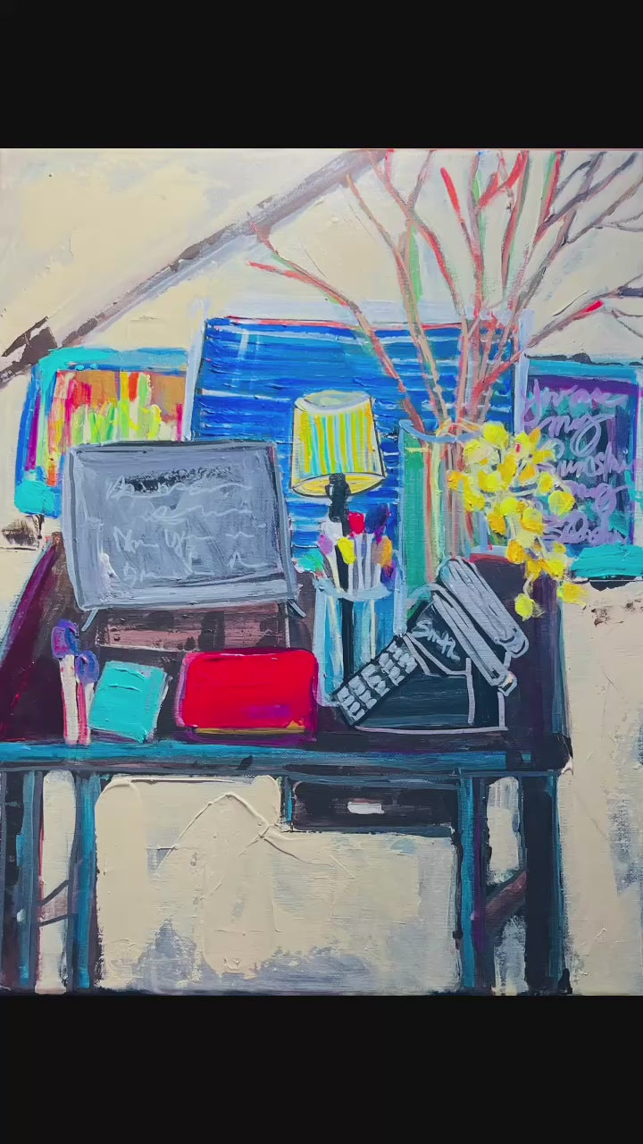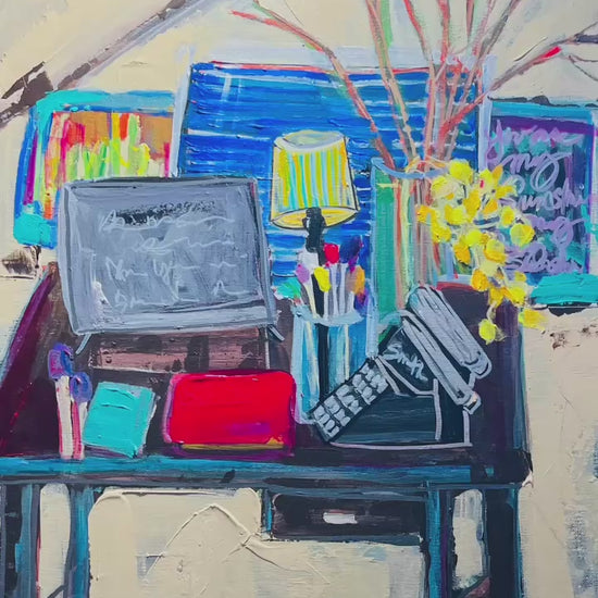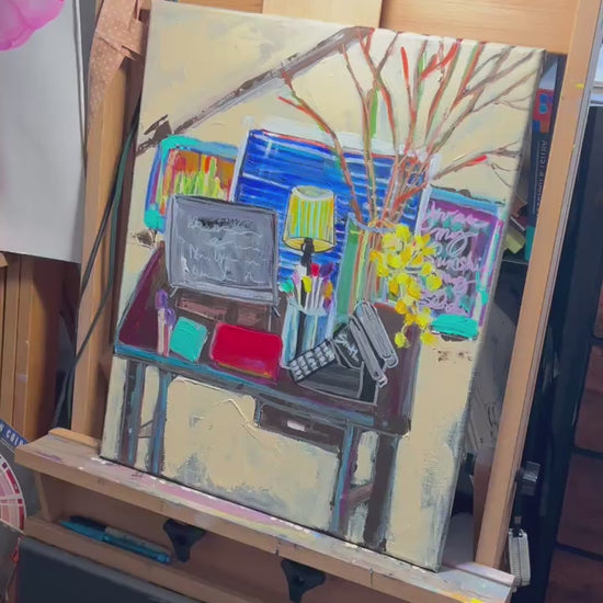 The artwork is an expressive painting of a cluttered desk set against a simple background. On the desk, there is an open laptop with indistinct markings on its screen, positioned centrally. To the right of the laptop, a vintage typewriter is depicted at an angle, adding a nostalgic touch. A clear glass vase filled with various tools or brushes stands behind the laptop, accompanied by a lamp with a striped shade that emits a warm glow. Yellow flowers burst from the vase, adding a vibrant splash of color. Behind the desk, there are hints of framed artworks or chalkboards in blue and green tones, enhancing the creative atmosphere. The overall composition combines bold colors and dynamic brushstrokes, conveying a lively and artistic workspace.