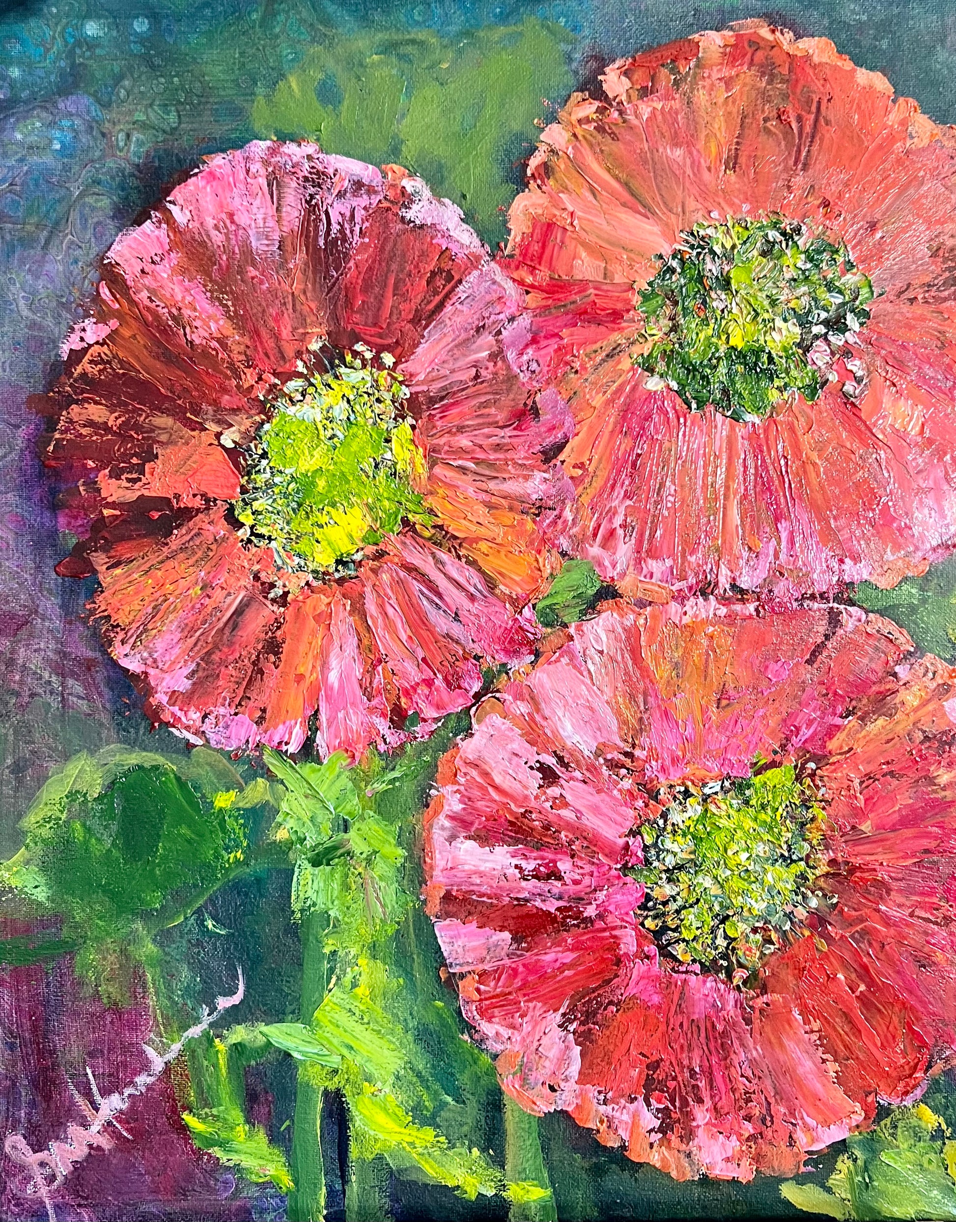The artwork is a vibrant and textured painting featuring three large flowers with bold, red-pink petals. The petals are painted with thick, expressive brushstrokes, giving them a dynamic and tactile quality. The centers of the flowers are bright yellow-green with intricate detailing, creating a strong contrast against the petals. The background is composed of deep blues and greens, providing a rich backdrop that enhances the vivid colors of the flowers. The overall composition is lively and full of energy, emphasizing the natural beauty of the flowers through intense color and texture.