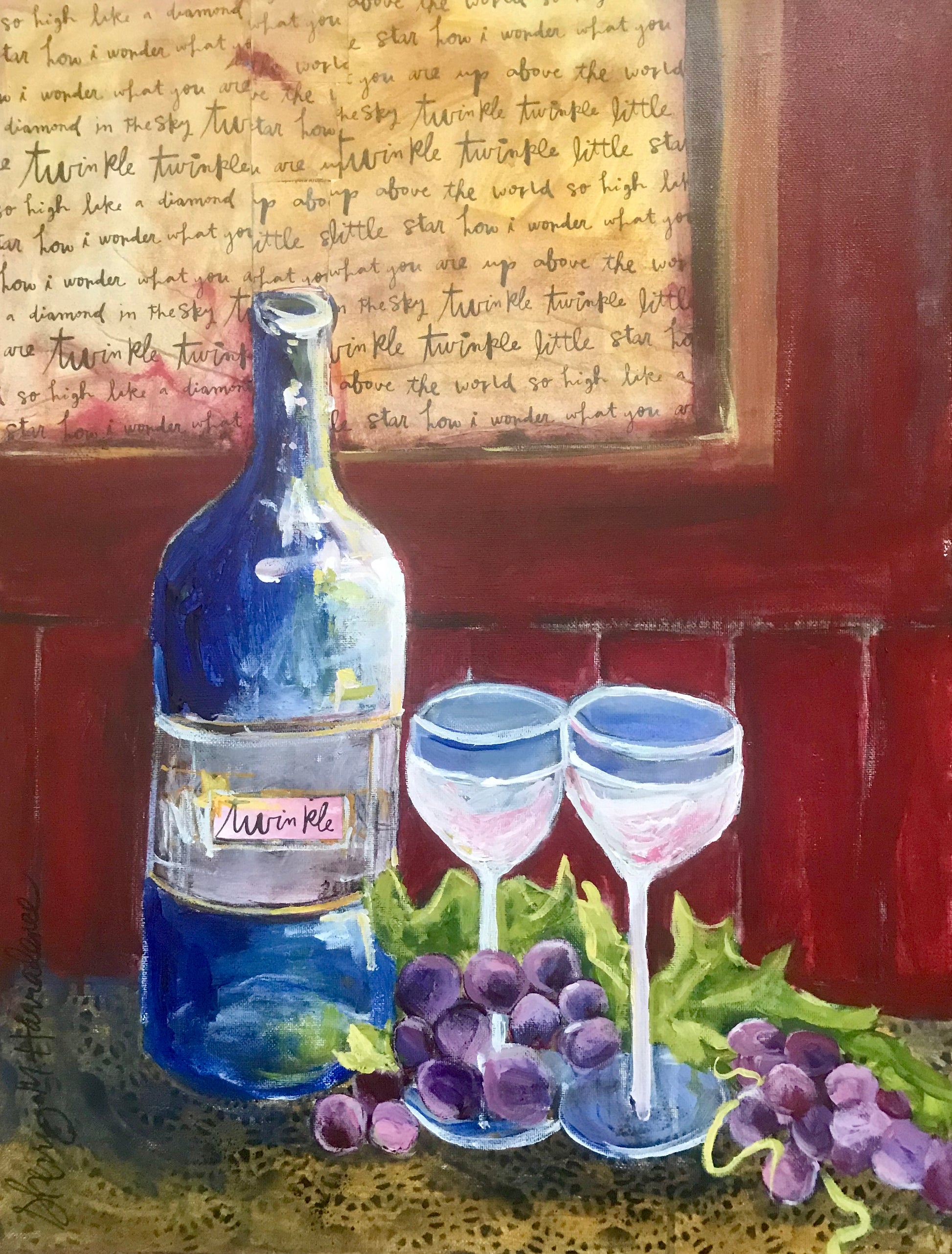 The artwork features a still life composition centered on a dark blue wine bottle labeled "twinkle," accompanied by two nearly filled wine glasses. The glasses have a subtle blue tint and stand on a textured surface scattered with a small bunch of purple grapes and green vine leaves. The background is a deep, warm red, with a framed canvas behind the bottle and glasses. The canvas is filled with repetitive handwritten text in black ink, with the phrase "twinkle twinkle little star" standing out prominently, adding a poetic and rhythmic element to the scene. The painting uses rich, warm tones and a painterly style that emphasizes texture and depth.