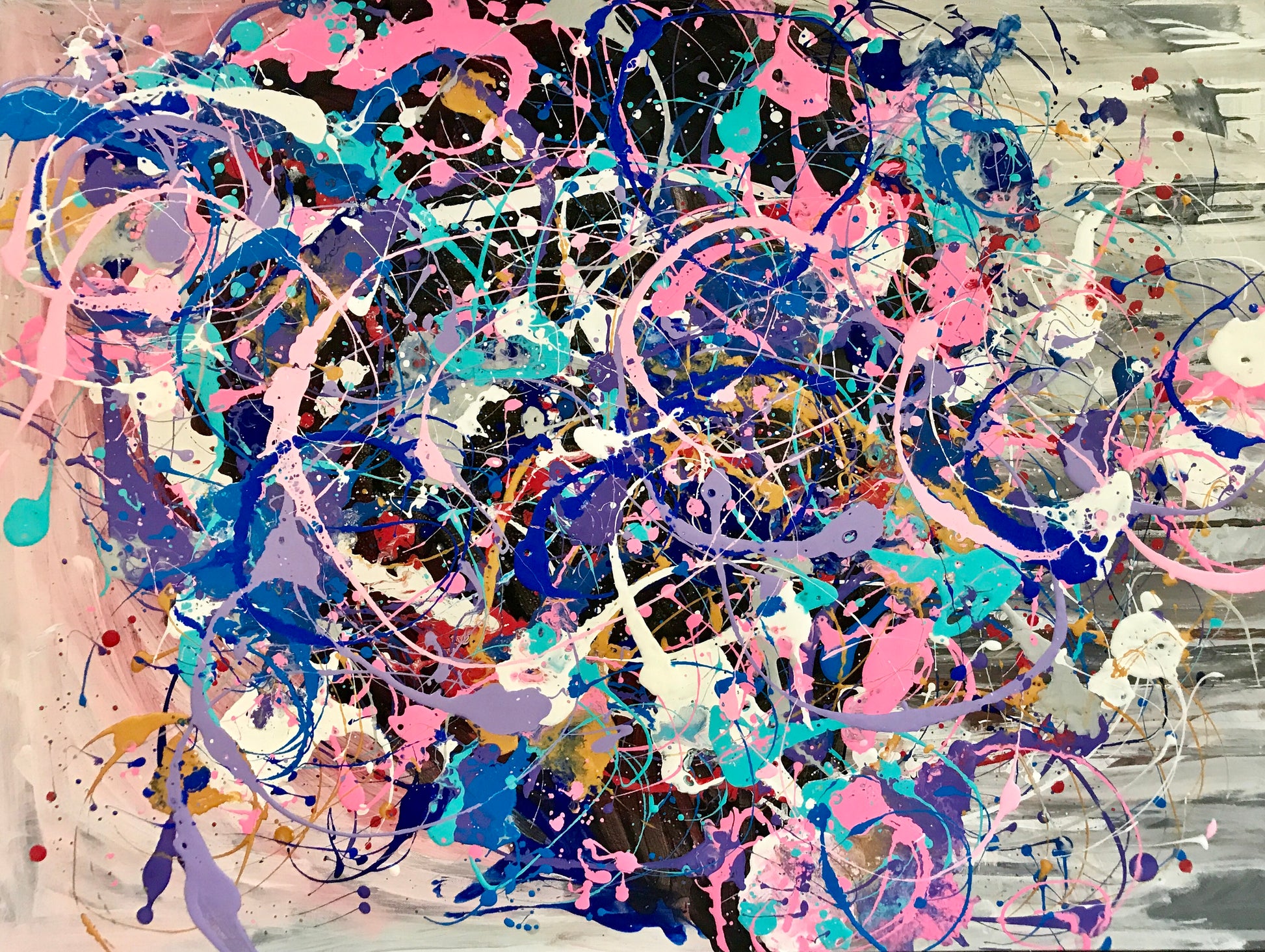 The artwork is a vibrant abstract painting characterized by dynamic swirling patterns and energetic splatters. It features a diverse palette dominated by shades of blue, pink, and purple, interspersed with touches of white, black, and turquoise. The composition is dense with layered brushstrokes and dripping paint, creating a sense of movement and depth. The right portion transitions into a more subdued area with grey and beige streaks, contrasting the vivid chaos of the central and left areas. The overall effect is a lively interplay of color and texture, evoking emotion and spontaneity.