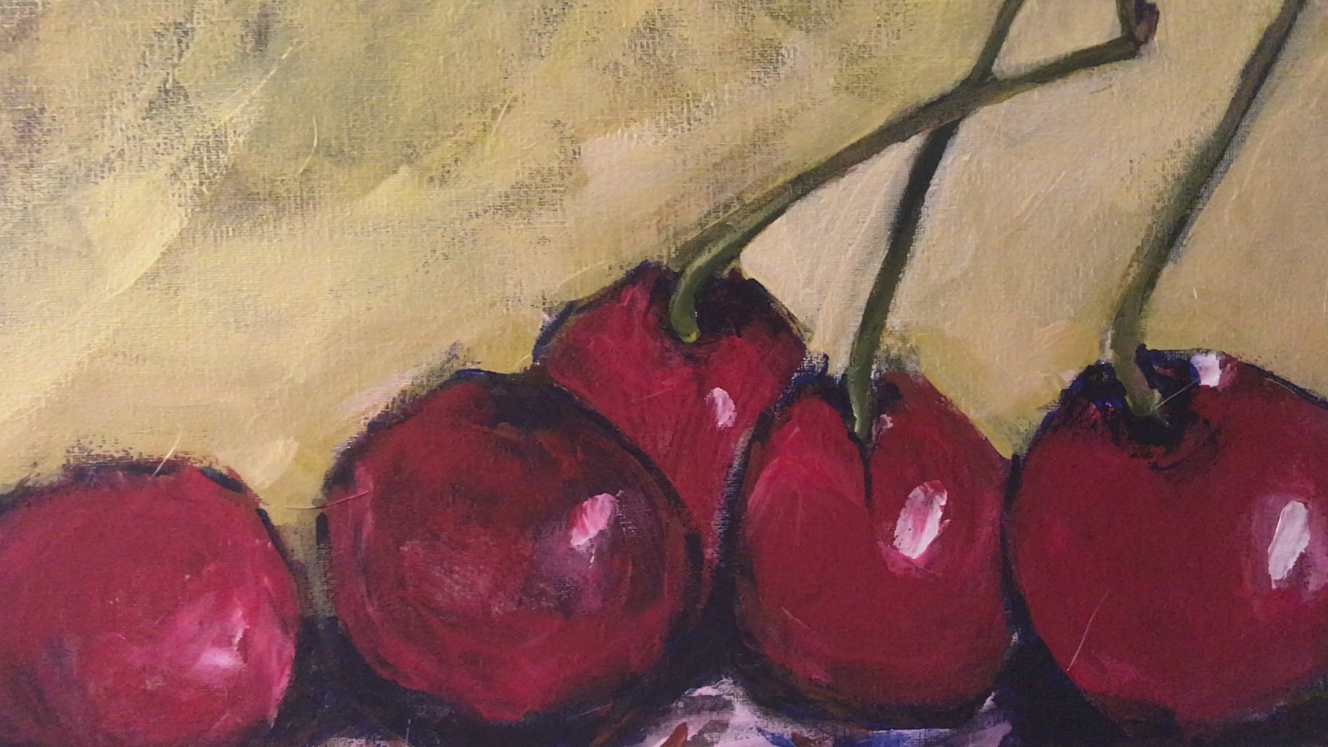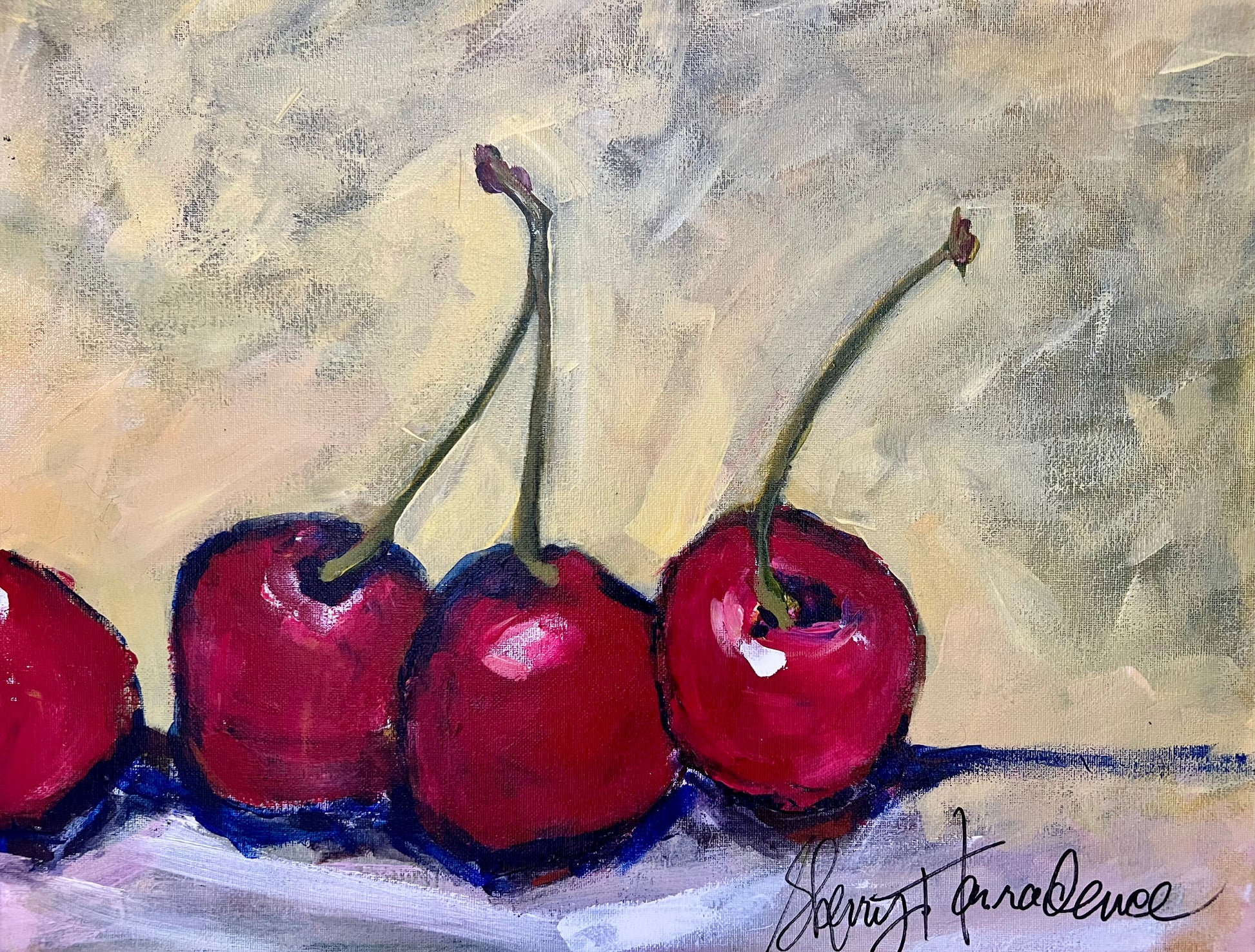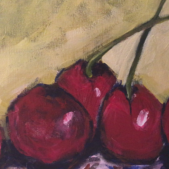 The artwork consists of two connected panels presenting a row of ripe red cherries with green stems, laid horizontally across a backdrop that blends soft yellow and muted green tones. The cherries are richly textured, using bold brushstrokes that provide a sense of depth and dimension, and they rest on a lively mix of white and blue hues that suggest a surface with subtle shadows. The composition is balanced between the two panels, creating continuity and harmony across the diptych. The painting captures the freshness and vibrancy of the cherries with a vivid and expressive style.