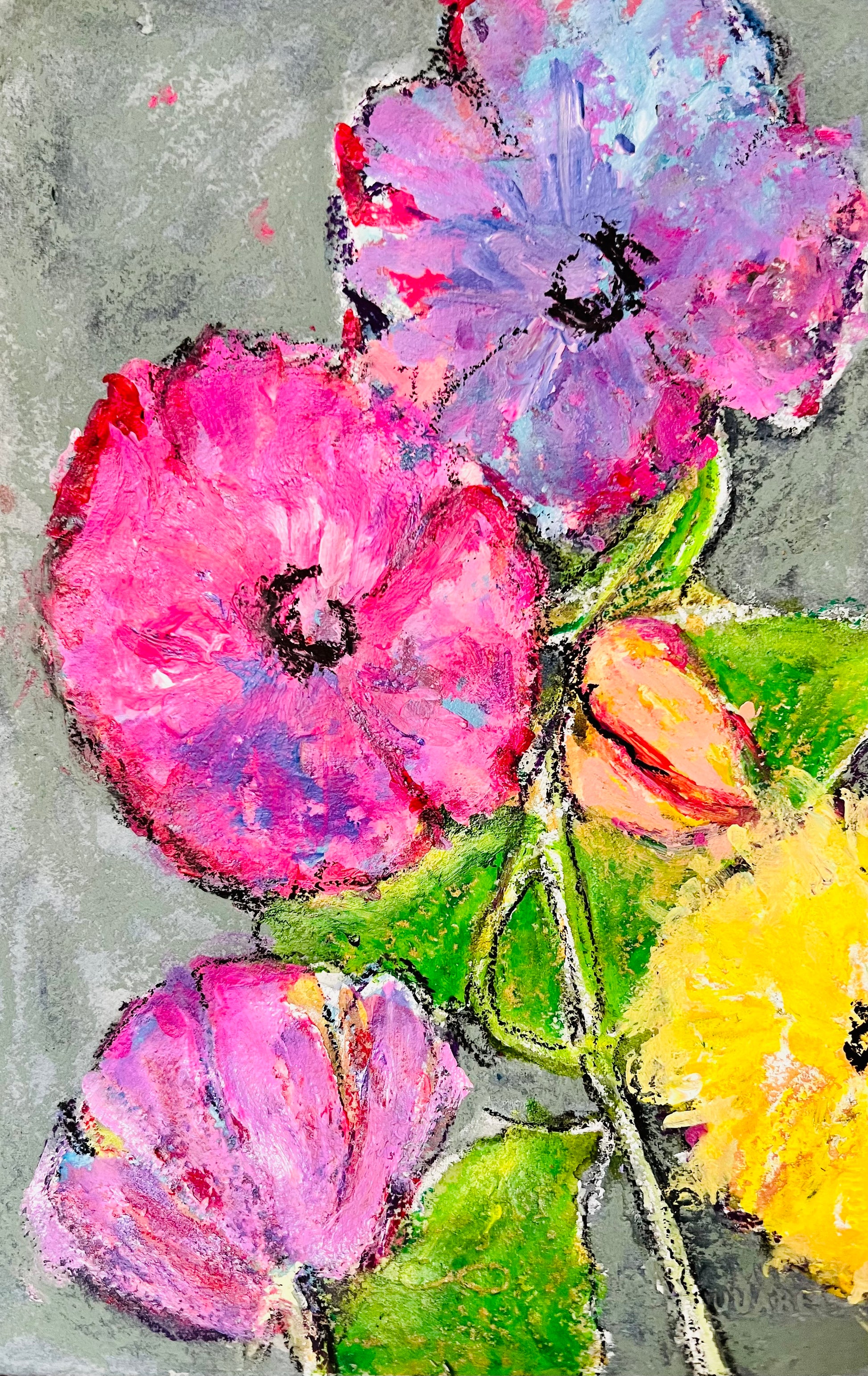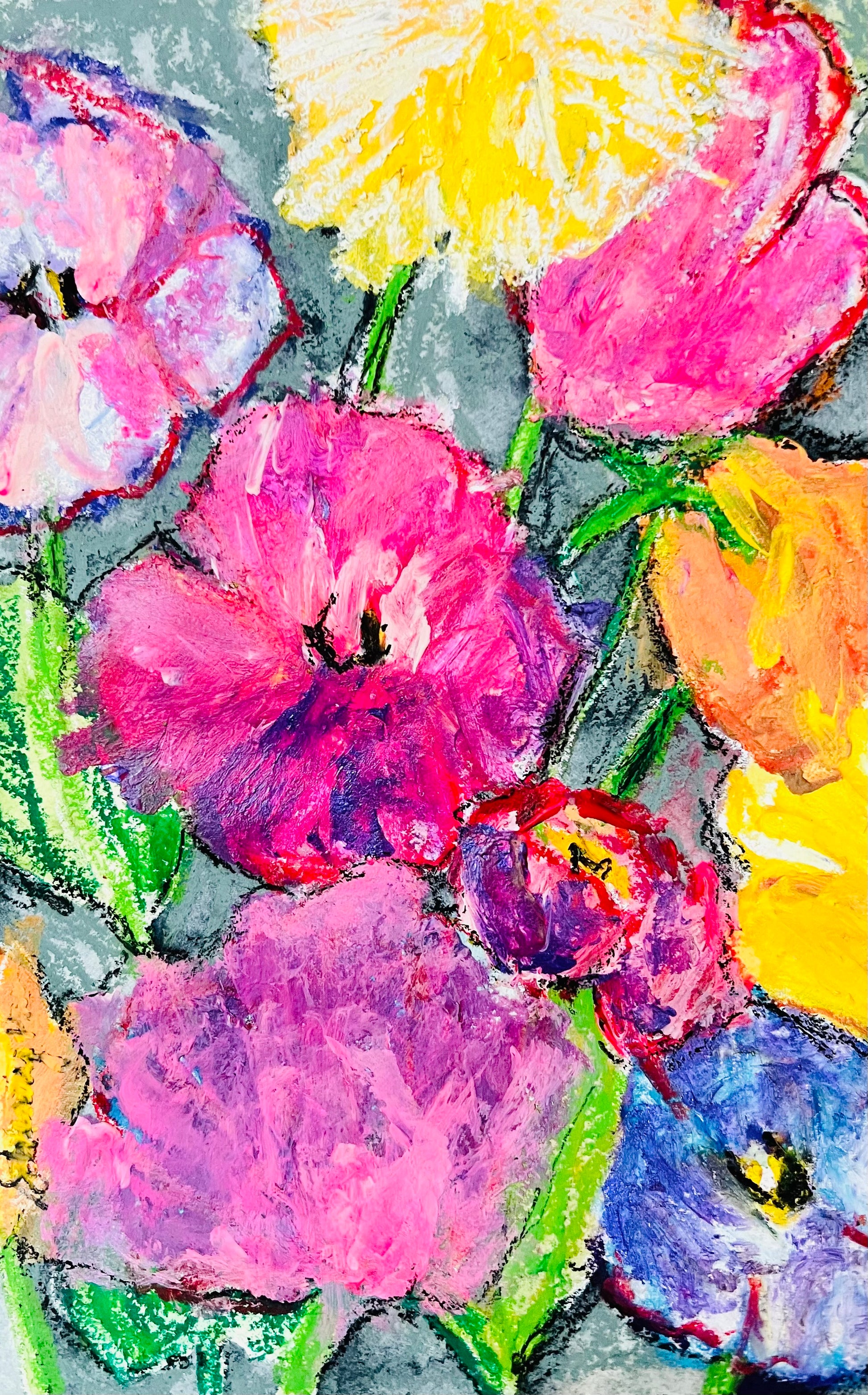 The artworks is a vibrant and colorful floral composition rendered in a textured, painterly style. It features a cluster of flowers with bold, expressive brushstrokes and a rich palette of pinks, purples, yellows, oranges, and blues. The flowers are densely packed, overlapping in a dynamic arrangement that fills the space, with green stems and leaves interspersed throughout. The use of vivid colors and textured application gives the piece an energetic and lively quality, emphasizing the beauty and variety of the blossoms.