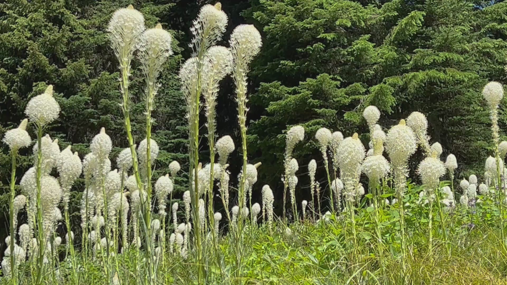 The artwork is an expressive painting of white flowers with green stems and leaves set against a vibrant blue background. The brushstrokes are bold and textured, creating a sense of movement and depth. The white flowers stand out prominently, with hints of yellow and light brown adding dimension. The green foliage varies in shades, from dark to light, complementing the lively blue backdrop. The overall composition is dynamic, capturing the natural energy and freshness of blooming flowers.