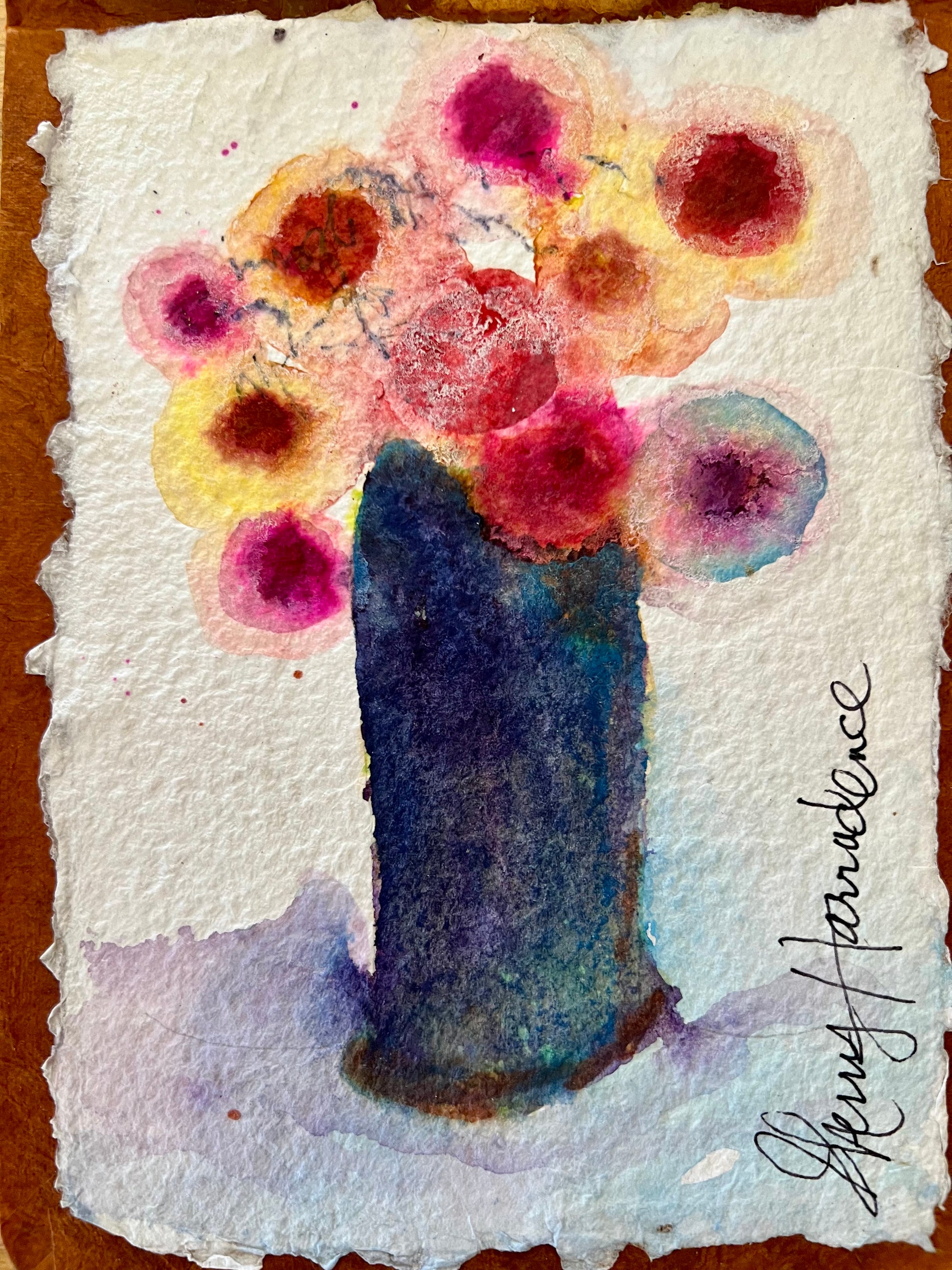 The artwork is a watercolor painting depicting a bouquet of flowers in a tall, cylindrical vase. The vase is painted in deep blue and purple tones with subtle variations that suggest texture and depth. The flowers are rendered with loose, circular strokes in warm colors such as red, pink, orange, and yellow, with some soft blending creating a dreamy, abstract effect. The background of the painting is left mostly white, highlighting the vibrant colors of the flowers and vase. The edges of the paper are textured and irregular, adding a handmade quality to the piece.