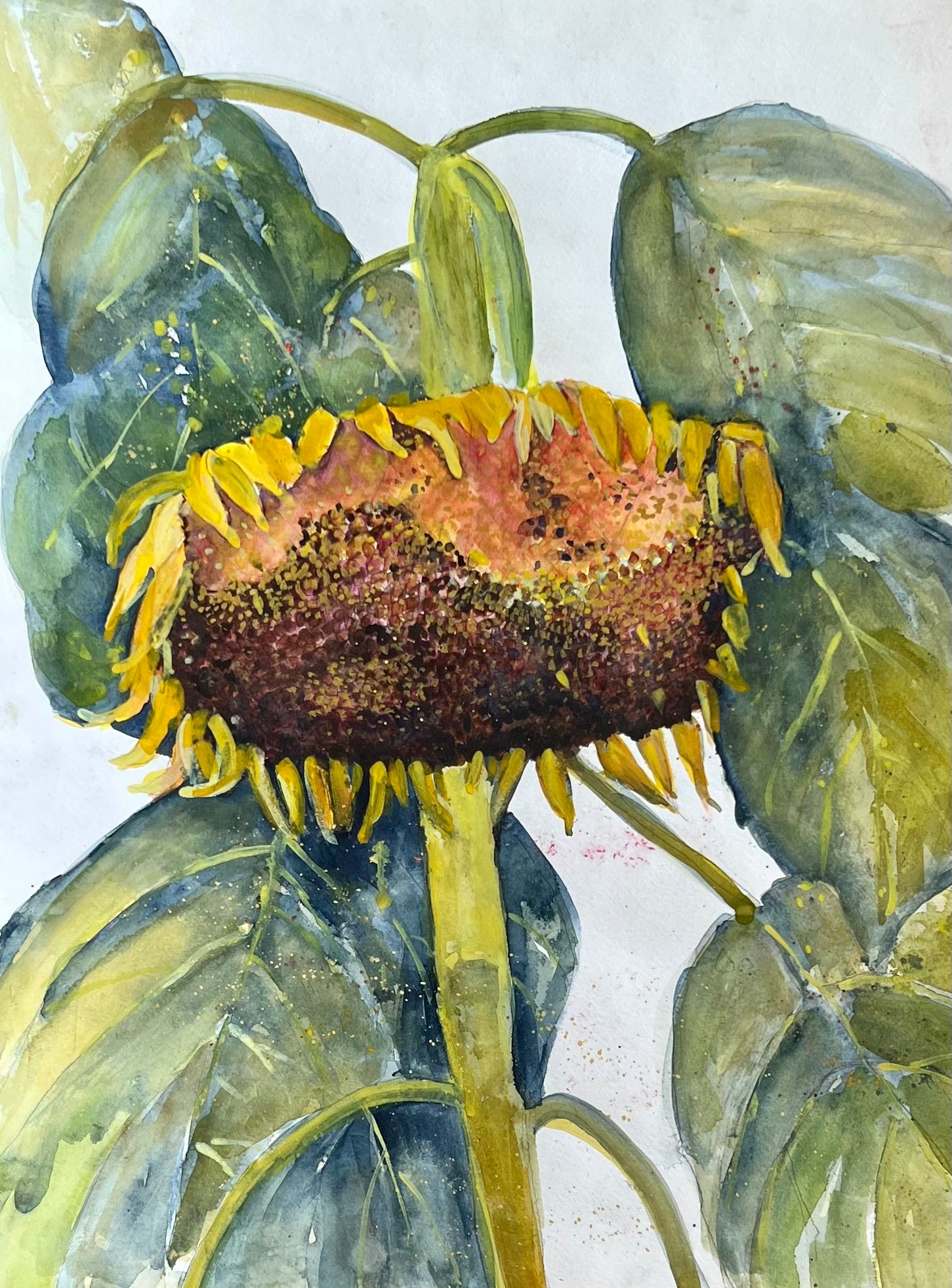 The artwork is a watercolor painting of a sunflower. The flower is portrayed in a downward-facing position, with its petals drooping and some missing, indicating a mature or wilting state. The sunflower’s center is richly textured with a mix of deep browns and reddish hues, capturing the dense seed pattern. Surrounding the flower head are large, green leaves with visible veins and subtle color variations that convey a natural, slightly weathered look. The delicate gradients and washes of green and yellow on the stem and leaves are rendered with a soft fluidity characteristic of watercolor technique. The painting uses light and shadow effectively to give depth and dimension to the sunflower and its foliage.